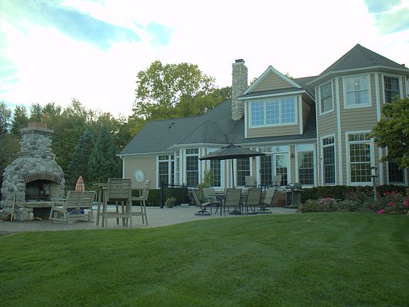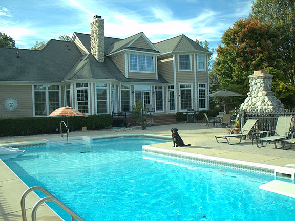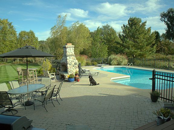 Traditional style farmhouse with wrap-around porch and rear brick pateio on over three acres. Spacious updated kitchen with granite countertops (2016). Open living room with stone fireplace and cathedral ceilings. Large first floor master suite with fireplace, master bath, and walk-in closet. Floor-to-ceiling windows throughout main level allow for loads of natural light. Custom finished basement with wet bar. Built-in pool, outdoor fireplace, and professional landscaping. Perfect for entertaining or enjoying nature in your own backyard.