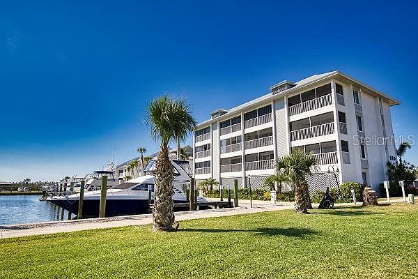 A MUST SEE! Ride the ELEVATOR to the 3rd floor. Perfect for the boater that wants his boat right outside his door. Fabulous sunsets and views from third floor looking south. Exquistely remodeled condo overlooking Palm Island Marina and Inter-Coastal waterway with direct access to the gulf. This delightful condo features complete kitchen remodel with stainless steel appliances, hard surface countertops, and custom light fixtures. Living room just painted and new carpet installed. Master bedroom carpeting with walk in closet. Move in ready with all furnishings included. ELEVATOR and convenient trash chute, exterior building recently painted. Community pool and Hot Tub party room with kitchen located a few steps away. Water/sewer/trash/ and beautifully landscaped grounds with security lighting are included in condo fee. Harbortown boasts convenient access to Palm Island Resort and Rum Bay Restaurant by water taxi featuring the finest beach in SW Florida.