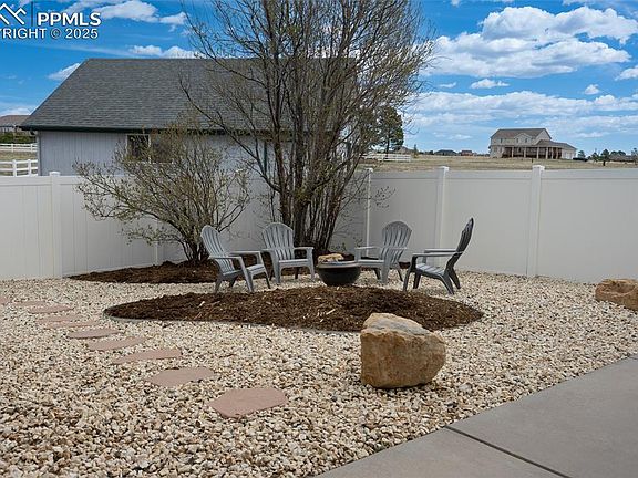 This well-maintained home offers the best of everything: rural serenity with community perks, like pond frontage with fishing rights and easy access to everything. Home is spacious, filled with sunlight, Pikes Peak views, abundant storage, on 2.5 acres, and Award-Winning D20 schools. The open floor plan connects the kitchen, living, and dining rooms, all illuminated by oversized, mountain-facing windows, a two-story cathedral ceiling, and a gas fireplace. The windows, equipped with motorized blinds, frame views of Pikes Peak and partial views of the Garden of the Gods or walk out to the Trex deck. The upgraded kitchen features new countertops, stylish backsplash, double oven, four-burner gas cooktop, microwave, hickory cabinets & new carpet & flooring as of 05/16/25. Dining options include a formal dining room, counter seating, and a breakfast nook. The main floor 27x15 master bedroom is a true retreat, a multipurpose area, with a 3-sided fireplace, and a 5-piece bathroom. The 2nd and 3rd bedrooms, of 5, are connected by a Jack & Jill bathroom and are on the main floor. The basement features a 30x26 family room, two bedrooms, a full bathroom, large storage areas, and a third gas fireplace. 2 garages: an attached oversized three-car and a detached, 30x24 with an accessible attic. Both have 220V outlets for a welder or EV charging Five minutes from Saint Francis Medical Center, Powers, Woodman, Marksheffel, Research, and Black Forest roads offer easy access to stores, restaurants, schools, and outdoor activities. 25 minutes to Colorado Springs Airport or 75 minutes to DIA. Upgrades include new flooring in main floor bathrooms, high-speed fiber internet, and paid-for solar. The solar system generates more electricity than the home consumes. A central vacuum system. This rural-style community on a cul-de-sac offers pond frontage, fishing rights to two community ponds, and maturing pine trees, aspen trees, and a producing peach tree.