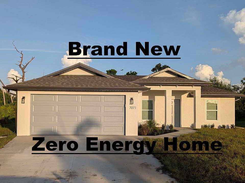 Available 9/1/25 - Be the first to live in this brand new 2025 Certified Zero Energy Home with Solar and a Tesla/EV plug in the garage. Featuring vaulted ceilings, luxury vinyl flooring throughout, granite countertops and is only 6 miles to the beach. Local Owner/Manager. This split plan 3 bedroom 2 bath home with 2 car garage will be your perfect home with all of the latest conveniences. You'll save hundreds on your electric bill and have a noticeably more comfortable home. The solar PV system powers the home and can charge an EV. Any excess power generated goes back to the grid as a credit to your bill. As a Certified Net Zero home, your electric bill could be as low as $35/mo depending on your usage. The luxury vinyl flooring throughout is in a perfect grey color, and is sure to compliment any furnishings. Vaulted ceilings in the main living area and kitchen give a roomy feel. Kitchen includes stainless steel appliances, a side by side refrigerator with water and ice dispenser, glass top range, dishwasher, built in microwave, beautiful cabinets, granite countertops and a large island with breakfast bar. Ceiling fans in all rooms and elegant light fixtures in the main area. The Master Bedroom is big enough for a king size bed, has two closets, two sinks, a private toilet room & a linen closet. The laundry room has washer/dryer hookups and a monitor for the PV Solar System. Hurricane rated impact windows & doors, city water, a garage door opener with exterior pin pad and Florida friendly landscaping complete this beautiful home. Not in a Flood Zone. Hurricane rated to 160 MPH winds. Impact windows - so you don't have to put up shutters. Available 9/1/25 $2,149/mo with $2,149 deposit. $35 Zillow Application fee for each adult (good for 30 days for other rentals too). 12 Month Lease. Tenant pays electric bill (could be as low as $35/mo depending on usage). Tenant pays water bill. Tenant maintains lawn. Trash is paid through owner's property taxes. No other fees from us.