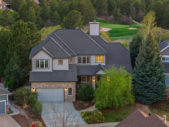 Perched just off Hole #12 of The Ridge at Castle Pines Golf Course, this stunning home offers unobstructed views from Devils Head to Mt. Evans. A brand-new expansive back deck and private upper deck off the Primary Suite provide the perfect vantage point, complete with a gas line-fed blue glass fire pit for year-round enjoyment. Inside, you'll find newly refinished oak floors and a striking Da Vinci four-sided glass fireplace with color-changing glass stones. The kitchen boasts updated appliances, including a newer dishwasher, refrigerator, and cooktop. The Primary Suite received a full refresh in 2024, including new flooring, custom cabinetry, quartz counters, updated lighting and fixtures, and a luxurious new shower. The finished basement includes a guest room, full bath, TV room, sports bar, and sauna—ideal for entertaining or hosting guests. A full HVAC system—furnace, A/C, humidifier, and hot water heater—was installed in 2021 for comfort and peace of mind. Additional updates include new exterior paint and lighting, and stylish ceiling fans in the main living area and Primary Suite. This home seamlessly blends elevated style with modern function—all in a prime Castle Pines location with breathtaking mountain and golf course views!