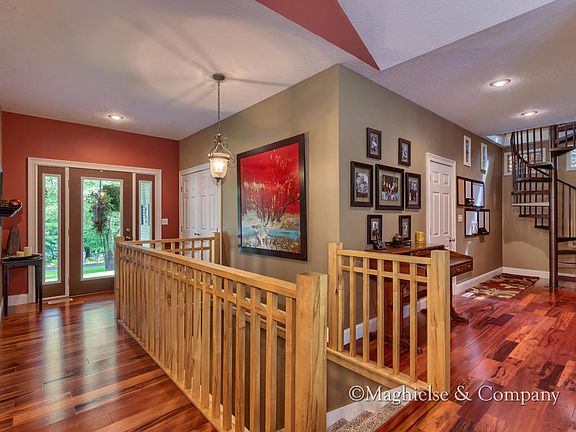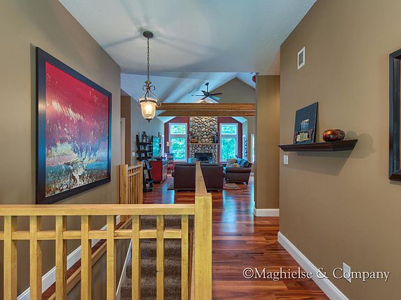 Everything about this property will make you say ''I'm home!'' Large wood/stone columned front port invites you to enjoy the wooded hilltop view. Soaring wood beamed ceilings and open concept living space are kept cozy with Tigerwood floors throughout the main floor living areas and floor to ceiling fieldstone fireplace. The chef in you will love the kitchen. A spiral staircase leads to a bonus room/bedroom above the garage. The main floor offers the master suite, second bedroom and homework room with individual work stations. Custom hardwood railing surrounds the wide staircase to the full finished walkout with 9' ceilings, laundry cedar storage room, kitchen/bar area and additional bed and bath. Enjoy the spacious outdoors from deck, stone patio or fire pit! A must see beautiful home!
