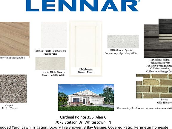 Final opportunities for Lennar at Cardinal Pointe, at the Golf Club of Indiana! The Venture Alan ranch w/ 1673 sq ft, 3BR, 2 Full BA, 3 Car Garage. Featuring Lennar's Everything's Included with upgraded features throughout! Enjoy the Chef's kitchen with Stainless Steel appliances, Gas Stove, Side by Side Refrigerator, island with Quartz countertop, open to dining room and Great Room. Owner's suite with ensuite Luxury Tile Shower. 2 additional bedrooms and Full Bath. Exterior Covered Patio. Fully Sodded yard and Lawn Irrigation system. HOA $135/month includes Spectrum internet and golf club Social Membership. Community pool, pickle ball court, and play park now open. 20 minutes to downtown Indy, 5 minutes to Anson shopping. Purchase now for August Move- In! *Photos/Tour of model may show features not selected in home.