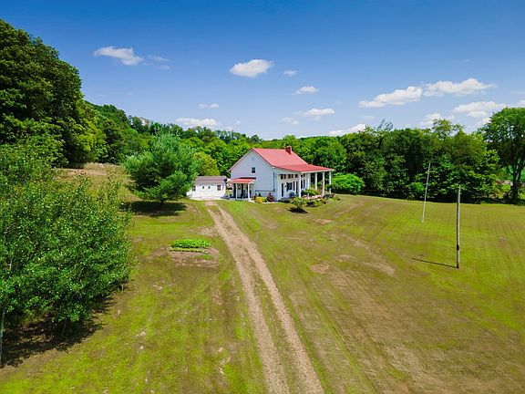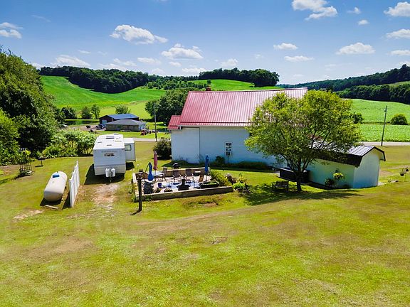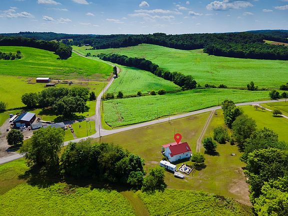 Beautiful historic home with the most amazing views of some of Butler's most lush farm land! Originally built as a school house in 1854, the property burned down & was rebuilt in 1913 w/ double thick brick walls. Since then it's been remodeled into a homestead w/ meticulous details & modern amenities while keeping the charm of the past. Spacious open kitchen w/ wormy chestnut ceiling & wallboards & stainless appliances. Living room w/ a wood stove & brick hearth surround. Upstairs the main bathroom has recently been remodeled & features a soaking tub w/ skylight window above. Primary bedroom featuring a private bathroom & built-in laundry. Third floor attic offers tons of storage space & the potential for more living area. Beautiful outdoor spaces including a two story covered front porch, spacious concrete patio area & 10 x 20 storage barn. Metal roof replaced 2011, 200 AMP panel new 2023. Propane budget is $140 a month & electric averages $120 a month. True beauty country living!