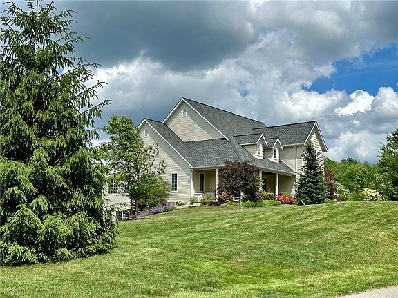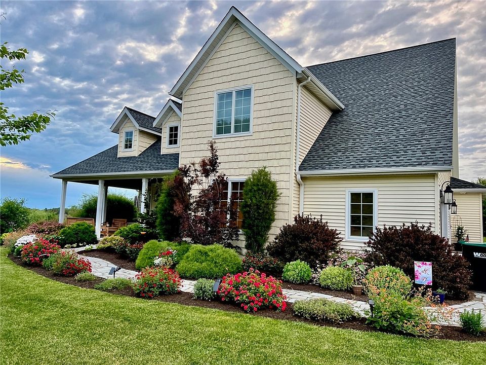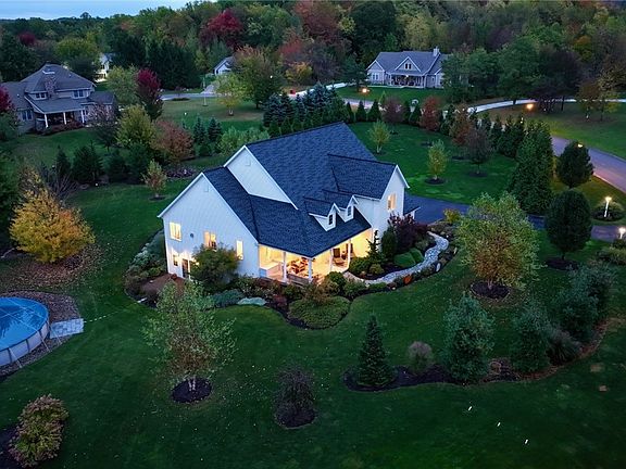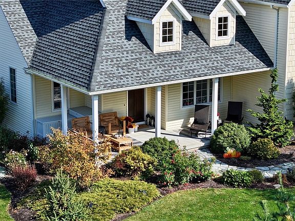 Nestled in the coveted Field Stone subdivision. 2 acres of privacy, close to Lake Erie, local wineries, shopping, amenities & schools. Featuring an award-winning kitchen from 2012, commercial gas range & kitchen island that comfortably seats six, hickory hardwood floors, 9 ft. vaulted ceilings. Exquisite master bath w/ dual shower-heads, a bench, all enclosed in a glass enclosure. Cast iron double-ended slipper tub & spacious master walk-in closet, 30 oversized windows & elegant light fixtures in every room. Oversized front porch & patios. Professional landscaping, perennial gardens & heated pool. Privacy screens & winding natural bluestone walkway, finished garage w/ 12 ft. ceilings, white-washed knotty pine ceilings, custom Canadian newel post, decorative heating vents, solid core doors, white porcelain door knobs, 4 ft. wide hallways & stairs, end of driveway lighting, 1st floor laundry room, custom wall & ceiling paint throughout. It's a must see!