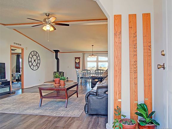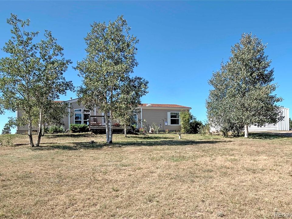 Wonderful 3 bedroom/2 bathroom modular home located in country on 5 acre property with amazing Pikes Peak views. Enjoy the peaceful setting away and mountains in this great location with easy commute to both Denver or Colorado Springs. New carpet in master bedroom and wood laminate floor throughout most of the home. Open floor plan with vaulted ceiling and fan in the living room open to the dining room space. Enjoy mountain views from the master bedroom, dining space and from the kitchen sink. Lewis Palmer School district, Remodeled kitchen is light and bright with skylights, white cabinets, and stainless steel gas oven range, microwave and refrigerator. Kitchen also has beverage/coffee bar and bonus pantry. Washer and dryer in laundry room also stay with home. New roof and garage door will be replaced soon as part of hail claim. Wood burning fireplace in dining space can heat most of the main level. Zoned for horses, goats and chickens!!! Low annual Hoa dues of $125/year.