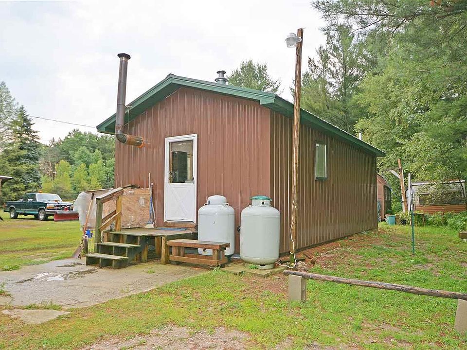MANY POSSIBILITIES. 1.21 acres with mobile home pad and camp-like structure; currently used as a nonconforming home (16x30). Fully insulated, heated with wall unit and wood stove; modern electric & plumbing. Plow truck, generator, & remaining wood stays. Two older septic units and well in working order, but septic(s) will need to be updated before new owner occupies. Lots of projects, but lots of possibilities!! Sold as-is. No owner financing/no land contracts.