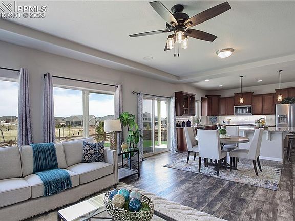 Live a Country Club Life All Year Long! This stunning two-story property boasts 6 bedrooms, 4 bathrooms, and is located in the highly desirable Banning Lewis Ranch neighborhood. Positioned on a corner lot, the home overlooks open space, providing breathtaking views. As you enter, you will be welcomed by an open floor plan that seamlessly flows from the living area to the dining area and kitchen. The kitchen is fully equipped with modern appliances, lovely finishes, and an oversized granite island that offers ample prep and counter space. The backyard is fenced for privacy and features low-maintenance turf and a concrete patio, perfect for hosting gatherings and outdoor barbecues. The home also comes equipped with solar panels, which will be paid off at closing. Upstairs, you will find three bright and spacious bedrooms, all offering stunning views of Pikes Peak. The primary bedroom features an ensuite bathroom, double vanity, and a walk-in closet. Recent upgrades include new carpeting and engineered hardwood flooring, as well as new tile in the fully finished basement bathroom. The covered patio is perfect for enjoying the open space scenery, and the community offers fantastic amenities such as a recreation center, Olympic size pool, long water slides, splash zone, fitness room boasts high tech equipment machines, free weight, floor exercise space reserved for those with the heart for Zumba / Yoga, pickle-ball courts, parks, hiking trails, concerts dog parks, and a weekly food truck and market event. Just what the doctor ordered – PEACE, FRESH AIR and SUNSHINE! A network of pasillos (open space corridors). 75+ acres of parks, trails and open space right outside your door! Don't miss out on the opportunity to make this incredible property your new home. Schedule a viewing today!