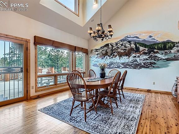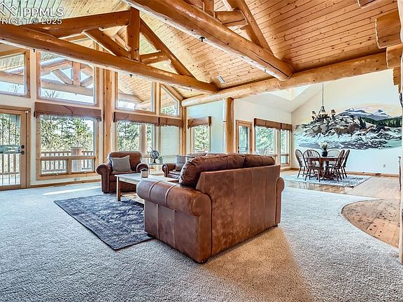 Discover the perfect blend of luxury and tranquility in this expansive 5,135 square foot home featuring 4 spacious bedrooms, 5 bathrooms, and breathtaking panoramic views. Designed for both comfort and entertaining, the open-concept layout includes center island kitchen with knotty pine custom cabinets, elegant dining area with a custom mural, and multiple living spaces with large windows that bring the outdoors in. Bonus open living area in the loft with a built-in office space and a covered patio with stunning views. Main level family room features soaring t&g ceilings with 18' log beams and a 3 sided floor to ceiling stone gas fireplace. Large Primary bedroom retreat complete with a gas fireplace, sitting area, private deck, and large walk-in closet. 5 piece primary bath includes separate sinks, cabinets and counter space, jetted soaking tub and walk-in twin head steam shower. Walkout basement boasts a huge great room with built-in entertainment center. 3 additional bedrooms and 2 baths. The home includes both an oversized attached 3-car garage and an additional 3-car detached heated garage, perfect for car enthusiasts, workshops, or extra storage. Enjoy ultimate privacy and space with 35 pristine acres, ideal for equestrian use, outdoor recreation, or simply soaking in the natural beauty. Outdoor living space is abundant with a garden level back patio, covered front porch and expansive back deck perfect for entertaining or relaxing and enjoying the views, trees and wildlife. This rare property offers the feel of a secluded mountain escape while remaining just minutes from town amenities in nearby Larkspur, Castle Rock or Monument. Whether you're looking for a full-time residence, vacation property or investment opportunity, this property delivers unmatched value and potential. Situated perfectly between Denver International Airport and Colorado Springs Airport for added convenience.
