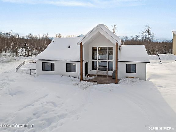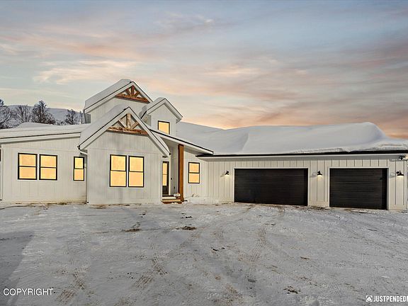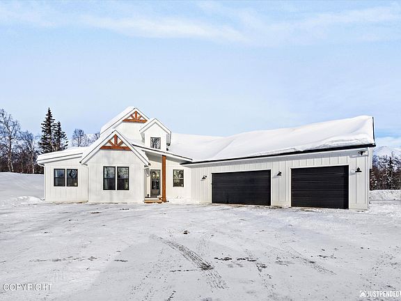 Stunning Modern farmhouse built by award winning JDL Homes,features 2,332 sf with 4 Bedrooms,Office,2.5 Baths and1,025 sf garage.Step into luxury living with 25' great room ceiling with a wall of windows overlooking breathtaking Hatcher Pass,Grand Stacked Stone Fireplace,hand hewn beams,open concept kitchen with oversized quartz island,hidden walk-in pantry and white cafe series appliances.Primary bedroom has large windows with mountain views featuring a large bathroom with freestanding soaking tub and oversized walk-in shower. Imagine entertaining under a large covered patio with wide plank stamped concrete. This unique 2.5 acre property has two creeks and allows horses. A 30 ft deep garage with an additional pull through garage door, 220 outlet and exterior RV Power. Additional features include Generator Switch for entire house, upgraded cabinets in living room, laundry room, exterior hot tub wiring, and a large bench with built-ins. Neighborhood backs up to Government Peak Recreation Area that has miles of light trails for skiing, mountain biking and hiking. Skeetawk is only 10 minutes away.