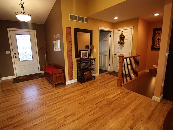 Custom-built home in 2010 that features an open floorplan with hickory hardwood flooring throughout. The living room features a vaulted ceiling, gas fireplace and built-ins around. The kitchen has a 7' island with granite countertop, walk-in pantry and an abundance of cherry cabinets. The dining room has a desk area built in along with a door to the back composite deck with stairs to the backyard. Finished walk-out basement has bathroom, large family room, office (which could be a 4th bedroom), theater room and utility/storage room. The house has geothermal heat with natural gas backup, natural gas fireplace in the living room and in-floor heat in the basement. It sits on a 1.27 acre lot on quiet dead-end road 1 mile north of town.