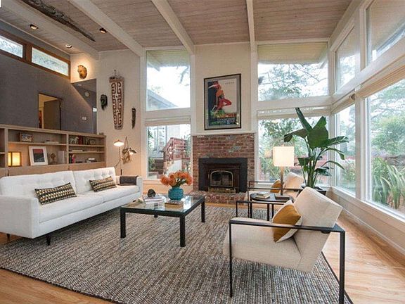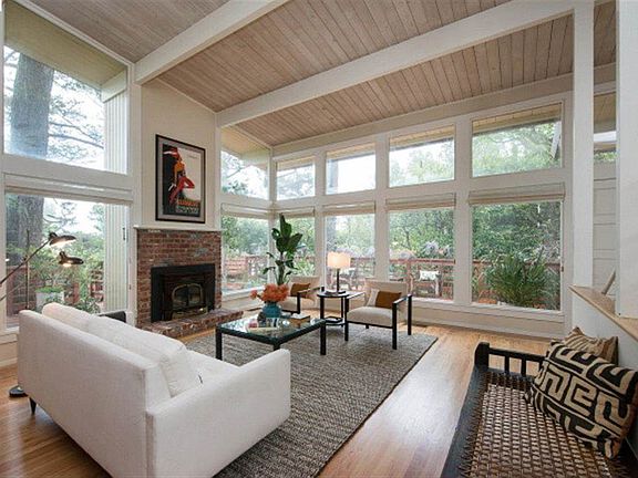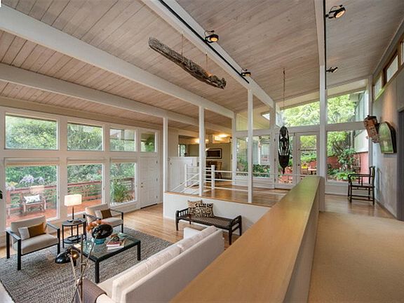 Fabulous Mid-Century Modern Home in a very serene setting. Dramatic sunken Living Room with walls of glass. Vaulted beamed ceilings. Gardener's paradise on x large lot with mature plantings. Wonderful indooroutdoor living with decks and patios...