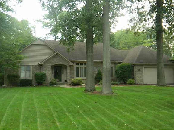 GREAT PRICE!Beautiful quality custom built brick ranch! Peaceful picturesque setting in Schildmeier Woods. Great room with cathedral ceilings and full brick gas fireplace. Kitchen features new stainless dw, refrigerator, & new counter tops! Gorgeous sun room & deck overlooking backyard w/mature trees, mini barn, finished garage w/offset & workbench. Elegant master suite w/separate access to deck. A beautiful home and a beautiful setting! Award winning New Palestine Schools!