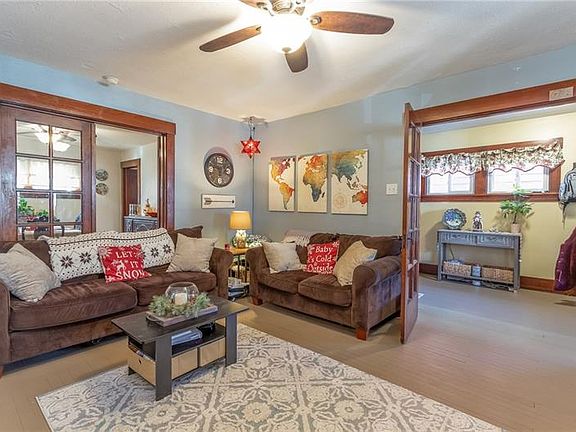 Old World Charm with all the modern amenities. Covered Front Porch perfect to sit out & enjoy morning coffee. Large Foyer with beautiful french doors leading to the cozy living room w/ picture window. Decorative fireplace, newly painted and new light fixtures throughout. French doors open to the large formal dining room. Plenty of room to host holiday meals. Original solid wood cabinetry in kitchen adds to the vintage charm. Original solid wood doors through out the home. Updated windows throughout. Amazing full bathroom has undergone a complete renovation and is sure to wow you! Master bedroom 16X12, all new lighting and paint. 2nd bedroom is 13X11 and has recently been updated with all new lighting, paint, & boasts hardwood floors. 3rd bedroom is a great size as well or use as a den. Lower Level has 1/2 bath and is being utilized as a gym area. Glass block windows, updated Lennox furnace, and updated hot water tank. Backyard is flat and fenced. Great for children to play or pets.