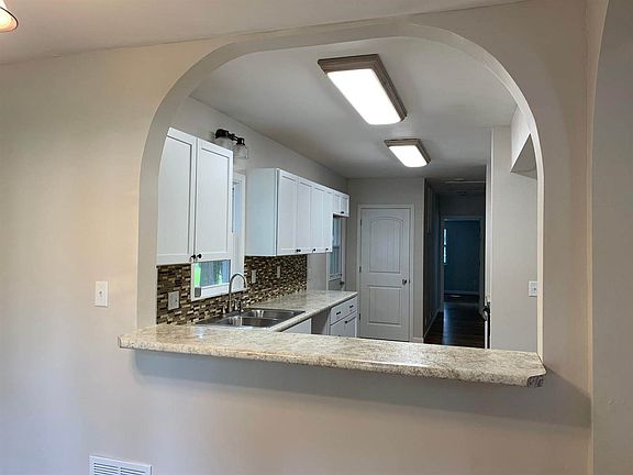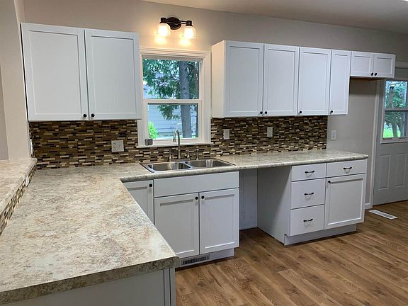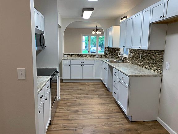 Looking for a completely renovated solid in-town home? Look no further this adorable bungalow has been updated throughout with a new kitchen, bathrooms, flooring, doors, and windows. The kitchen has a curved window opening to the dining area, glass tile backsplash, new cabinets, new stove and microwave, Living room has new flooring and the windows give it plenty of light. A full bath is updated with new fixtures & vanity, master bedrm has a walk-in closet and a private 1/2 bath. All new PEX plumbing throughout, LED lighting, and air exchanger, electric water heater in the basement. Hidden play area in the upstairs if you pull down the stairs in the hallway. Great place for a hobby room, play area, or storage...no heat or electric so isn't part of the sqaure footage. Outside you have a asphalt driveway to the 2 car garage which is insulated and offers storage upstairs. There is a shed at the back of the property as well. Cedar trees line one side of the property. Don't miss this one!