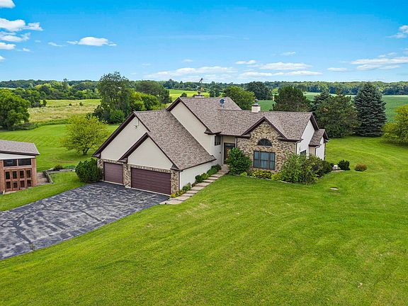 YOU WILL LOVE ENTERTAINING IN YOUR HOME WITH GORGEOUS VIEWS FROM EVERY ROOM! This stunning home on 7.75 acres has over 3,200 SF of finished living space. This immaculately maintained Tri-level with basement has the perfect layout with bright, open spaces and lots of light, vaulted ceilings and 2 fireplaces to make this home enviable. Entertaining is easy in the living room with cathedral ceilings and open to the spacious formal dining room and kitchen. The eat-in kitchen features a lot of oak cabinets for storage, island, and enough room for a large table. Sliding doors off the kitchen dining area lead out to the spacious tiered deck with gazebo with gorgeous views for miles. The MBR has a full en-suite bathroom large vanity, jacuzzi tub, separate shower with double rain shower heads and 2 walk-in closets, one is 12x17 a great bonus room and a private balcony to just sit and relax and watch the sunrise. Just across the hall are two more additional bedrooms and full bathroom. In the fully exposed lower level, you will find a large family room with a focal fireplace and another set of sliding doors that lead to a lower deck, where you can relax and enjoy the view of the backyard you need to see to appreciate. Also on the lower level is a half bath, laundry and a bonus room that could easily make a 4th bedroom or great office/den space. Great size basement area with commercial kitchen and walk in cooler. Outdoors your oasis includes a multi-level deck that leads to a peaceful gazebo. Plenty of storage for all the toys with an attached 3 car garage and a detached 3 car garage that has a attached custom sun room that boasts beautiful bi-fold doors and a custom made bar, a great place to entertain family and friends. A Generac Generator powers the entire house and garage within 10 seconds of losing power, never be without power! The house sits on 2.75 acres with the back 5 acres currently being farmed but would be a great space for horses. WAKE UP AND ENJOY WHERE YOU ARE LIVING!