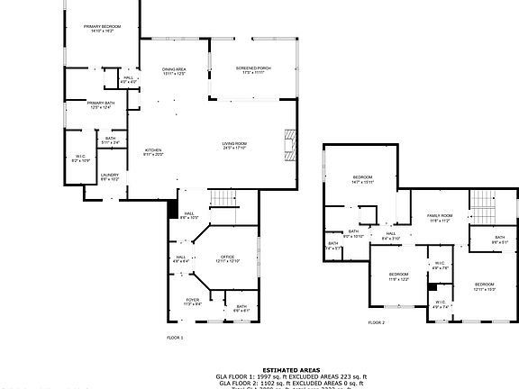 Enjoy the screened porch, saltwater pool, and lush landscaping. Inside features include 12-foot ceilings, a wood-burning fireplace, open living and dining, and a spacious kitchen with large island. French doors open to a private office; a half bath is nearby.