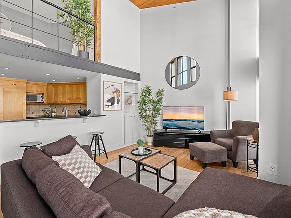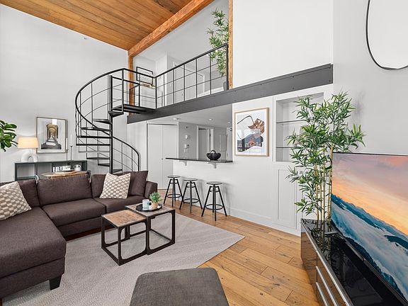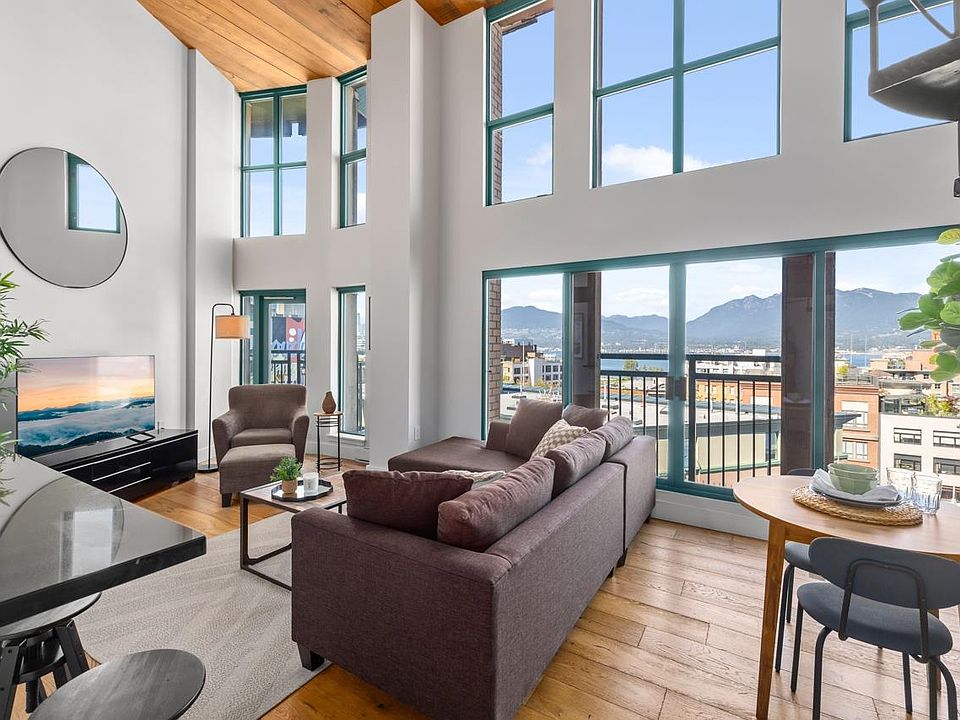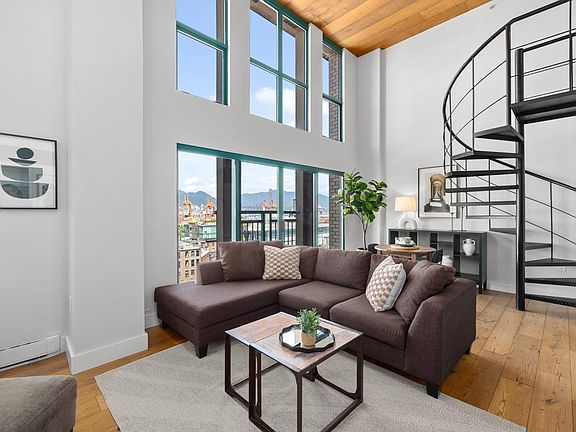 HELLO GASTOWN LOFT VIBES! Looking for the ultimate loft with soaring 16 ft ceilings and EXPANSIVE WATER & MOUNTAIN VIEWS for an incredible price? Welcome to Van Horne, a collection of artist style lofts in the heart of Downtown Vancouver with impressive architecture on two storeys with black circular staircase taking you up to your primary bedroom. Wake up to incredible views and large floor to ceiling windows for tons of natural light. Head downstairs to well laid out kitchen, dining/living room with in suite laundry. SS appliances, wood cabinetry, soaker tub in the bathroom. 1 parking included. Walk score off the charts! Surrounded by cool cafes, brunch spots, eateries, Local, famous steam clock, & transit.