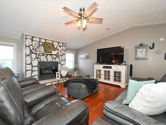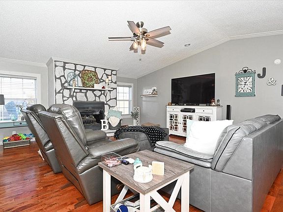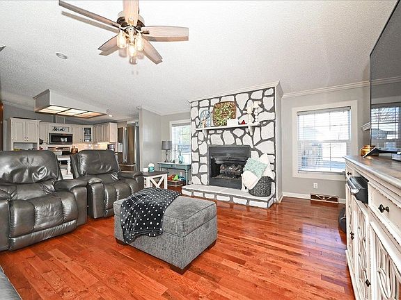 BEAUTIFUL, is the only word that comes to mind when describing this property. This split floor plan caters to the wants & needs of buyers in todays market. This double wide has been completely remodeled, with sheet rock, crown molding & wood window trim. Along with hardwood floors, ceramic tile & waterproof laminate. The kitchen has stainless steel appliances as well as updated counters, sink & back splash. The open concept living space has a rock fireplace w/vented gas logs. You'll have a nice sized walk-in closet with a built-in shelving unit in the primary bedroom w/attached ensuite. This well built home looks and feels just like a site built home, it was built with 2x6 walls at time of manufacture. Sitting on a 1 acre lot in a quite country setting, you'll be looking out over a field across the road from your covered front porch or deck. It has a wood fenced in back yard , a newer 8x12 storage shed as well as a 12x16 pull-in shed. Don't miss your opportunity to see this property.