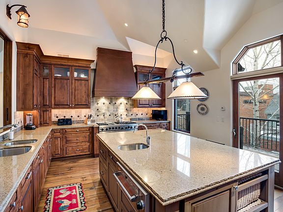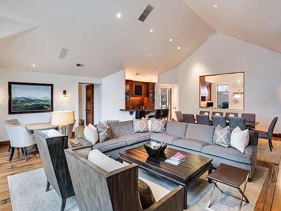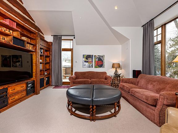 Spacious five bedroom townhome in the Core of Aspen, one block to the Gondola. Expansive open living area with stone gas fireplace, hardwood floors, vaulted ceilings, and large windows with breathtaking views of Aspen Mountain. Entertainment room with adjoining spacious wrap around private deck & hot tub. Gourmet kitchen featuring breakfast bar and stainless steel appliances. Master suite features gas fireplace, two walk-in closets & master bath en suite with his and her marble vanities, jetted tub, & steam shower.