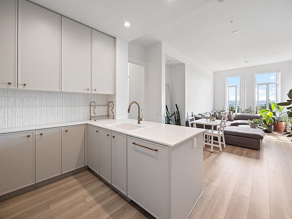 Smart open-concept livingOversized windowsModern kitchenSamsung appliancesQuartz countersLed lightingFull-sized in-suite laundry