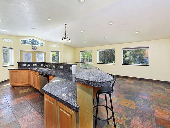 5 bedrooms + bonus rooms / office. Private 2.26 ACRES in heart of Kenai, close to schools. 2 car attached garage. Large & OPEN kitchen / dining room. GRANITE counters, custom maple cabinets, stainless appliances, VAULTED ceilings & slate floors. Living-room & entry have two-way gas fireplace. HUGE back DECK. Lots of LIGHT & STORAGE. New furnace.