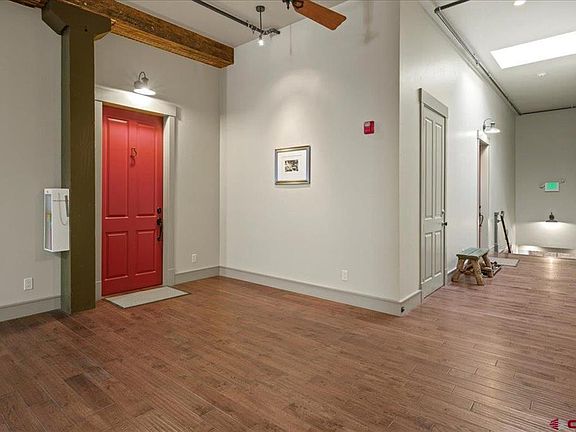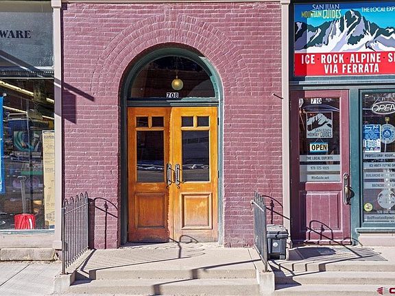 Discover the perfect blend of historic charm and modern luxury in this loft style condo located smack dab in the center of Ouray, Colorado. This fully-updated historic gem offers easy walking access to all that Ouray has to offer. Step inside to an inviting, open layout featuring high ceilings, exposed post and beam construction, and exposed brick walls that exhibit timeless character. The kitchen, dining, and living areas flow seamlessly, showcasing upgraded, newer finishes throughout: granite countertops, hickory cabinets, engineered hardwood plank flooring, travertine tile, efficient forced air heating and air-conditioning, and double-pane tilt-in windows. Relax in the cozy living area by the free-standing gas log stove. The entire building was renovated in 2010 with modern systems, including updated plumbing, electrical, insulation, fire suppression, and an elevator. High speed fiber internet is in the building. This unit includes its own private garage and a roomy, secure storage room, for effortless mountain living. Units in this building have a strong short-term rental history.