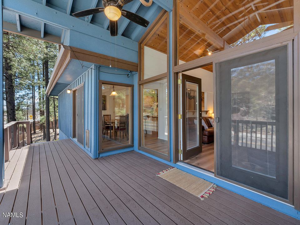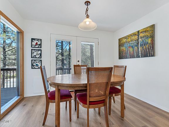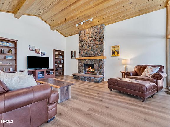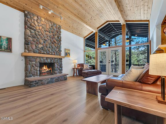 Welcome to your centrally located retreat! Nestled near downtown and NAU and just a stone's throw away from two grocery stores, this single-level home offers convenience and comfort. The inviting open floor plan combines kitchen, dining room and great room; floor-to-ceiling windows bathe the space in natural light, accentuating the elegant stone fireplace and vaulted tongue-in-grove ceiling. French doors connect indoor and outdoor living, inviting you to unwind on the covered Trex deck. Recently renovated, it boasts new paint, luxury vinyl flooring, and carpeted bedrooms, along with a new roof installed in October 2023. Spacious bedrooms include amenities such as a walk-in closet in the master bedroom and balconies accessible from every bedroom. Listing Agent is related to seller For added convenience, there's even a half-bath connected to the garage. The large, fenced yard, with a beautiful flagstone patio, is perfect for enjoying the beautiful Flagstaff weather. Urban homesteaders can continue the tradition of keeping chickens and bees on the property. The Urban Trail System (FUTS) adjacent to the property offers tranquil walks or jogs with frequent deer sightings. Don't miss out on this urban oasis!