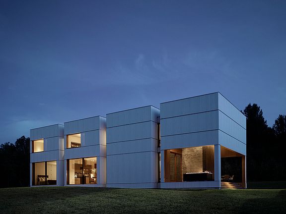 Minimalism at its most pure and elegant is captured at this striking hilltop estate, which was designed by world-renowned Chinese artist Ai Weiwei in collaboration with the esteemed Swiss design firm, HHF Architects. The only U.S. residence ever designed by the acclaimed artist, the home celebrates light and space with high-ceilinged streamlined rooms framed by vast glass panels that showcase the wonderful mountain vistas and expanses of solid wall that provide a stunning gallery-like environment for art. Magnificent in detail with immense structural integrity and an unrivaled modernist aesthetic throughout, the one-of-a-kind residence enjoys a beautifully designed setting enhanced with a wide array of specimen trees.Clad in aluminum, the silver-hued main house contrasts beautifully with the rust-colored guest house, both beautifully situated to take full advantage of the blissful landscape, which includes a heated pool, meandering trails and views of the Catskill Mountains, Taconic Hills and Berkshire Mountains. Ideally situated within 2 hours of Manhattan, this totally private setting enjoys proximity to Hudson – only 15 minutes away, as well as nearby Red Hook, Millerton, Rhinebeck and Great Barrington.