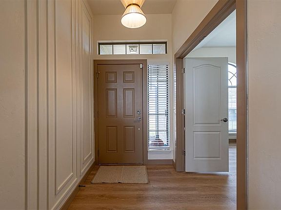 Tucked away at the back of the neighborhood, this charming three-bedroom, two-bath home offers a two-car garage and an optional fourth bedroom or home office. As you step inside, you're greeted by floor-to-ceiling board and batten in the foyer, complemented by caramel-colored wood trim and cream colored doors. Soft-toned laminate flooring flows seamlessly throughout the office or fourth bedroom, foyer, living room, kitchen, and dining room. The kitchen features a two-person conversation bar, a prep island and stainless steel appliances, and a bright window in the dining space. A spacious pantry and an adorable laundry room with a window and a student desk or folding shelf add convenience to laundry day. The primary bedroom offers two windows, a tray ceiling, and laminate flooring. While the glamour bathroom offers a large walk-in closet, dual vanities with solid surface sinks, and a sleek design. Secondary bedrooms have vinyl flooring, and the immaculate hall bath is spacious and inviting. 2022 roof, 2024 HVAC, storm shelter in garage. A fully fenced backyard provides privacy and the covered back patio allows for year-round enjoyment, making this home a perfect retreat. 10 minutes to the University of Oklahoma and downtown OKC is 29 minutes away.