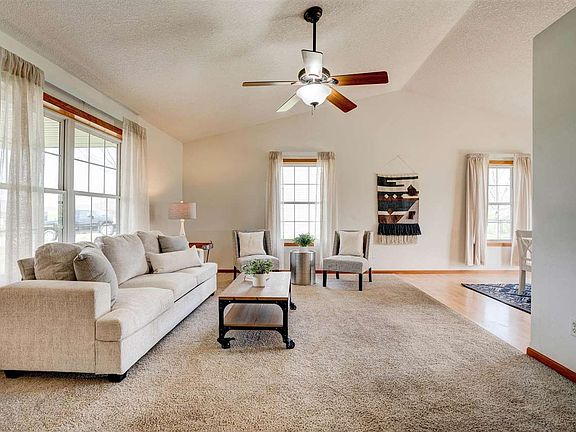 Great location on the West side of Kalona, this 3 bedroom, 3 bath home with attached 2 car garage is ready for you! It conveniently has "no step" entry, open living, dining & kitchen space, with vaulted ceiling, hardwood / carpet flooring. The primary bedroom with full bath & walk-in closet, 2nd bedroom & bathrm, laundry & multiple closets all on the main level provide the comforts of one level living. The lower level boasts a 21'x26' family room, bedroom, full bath & utility. This well built, one owner home is move in ready. Cosmetic updates would enhance & personalize to make your home ownership dream come true. The front & back patios embrace space for relaxation & enjoyment. The level yard includes trees & a hip roof lawn / garden shed.