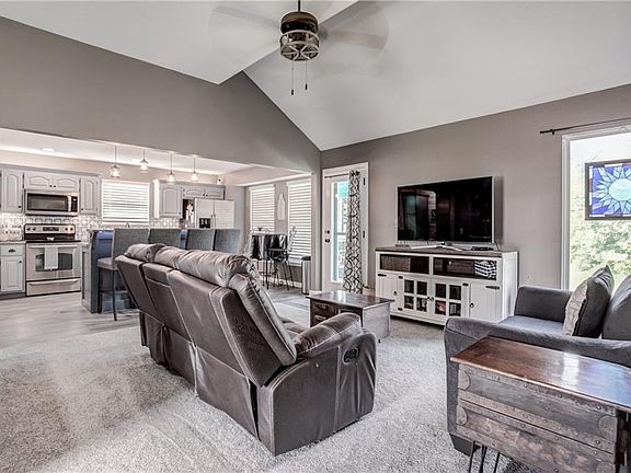 JUST WHAT YOU'VE BEEN WAITING FOR! Move Right in and ENJOY all the recent updates and remodeling this one has to offer! (All within the last 2-3 years!) Roof, Water Heater, Interior and Exterior paint-Kit update includes Painted cabinetry-Large Island w/ wine fridge-granite counter tops-backsplash-coffee bar-Newer stainless appliances-New Floor covering thru out-3 good sized bedrooms on main -1 main floor master suite w/newly re-freshed bath-Laundry rm w/built ins-Large back deck w/new stylish wood and metal railings...And that is just the main floor! Check out the recently finished basement w/comfortable family room w/large daylight window to let the sunshine in-Large Master suite w/ EVEN MORE windows Spacious walk in closet and attached bath features beautiful walk in shower! Bonus area would make a great reading nook and large unfinished area adds even more storage! All this and so much more sitting at the end of a cul de sac w/nothing but trees and wildlife as your neighbors to the west and located close to schools...While located under 30 minutes from KC Metro area the small town charm is definitely in tact!