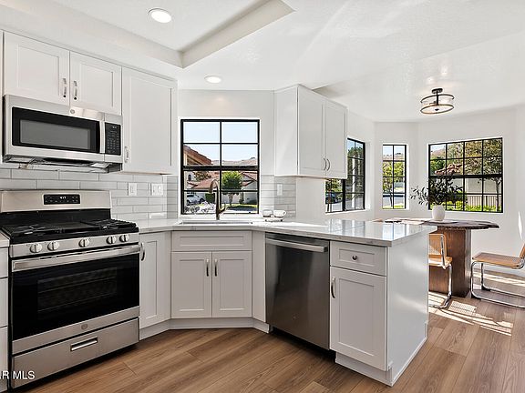 Welcome to this picture perfect 3 bed, 3 full bath townhome with an ideal location overlooking Wood Ranch Country Club in the gated Fairway Patio Homes community. Spread across 1535 square feet, this immaculate home combines luxury and comfort. The newly remodeled kitchen is a chef's delight with pristine quartz countertops, ample cabinet space, stainless steel appliances and a large breakfast nook. Luxurious vinyl plank flooring flows throughout, adding an element of sophistication, and a gorgeous brick fireplace is the centerpiece of the living room. The master suite, located on the main level, offers a tranquil retreat with its stylish, modern touches. A second bedroom also resides on the ground floor, with a third bedroom upstairs completing the versatile living spaces. The cherry on top? You'll enjoy afternoons in your newly landscaped yard while enjoying the stunning views of the Wood Ranch Country Club. The community also features a refreshing community pool and spa, promising an indulgent lifestyle in a prime location. Don't miss the chance to call this rare gem your home; it's more than a home, it's your personal paradise.