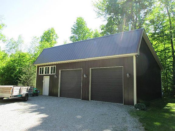 Great hide-a-way or primary home with secluded setting. Nestled in with one other home. Wonderful wooded setting with nice landscaping. Plenty of parking. Chalet style in great condition with cathedral ceilings in the living room that included ceiling fan and full wall brick fireplace. 2 bedrooms and 1.5 baths on main floor and 2 bedrooms up accessed by spiral staircase. Over sized detached 4 car garage with 2 sets of doors. Property has a shared driveway. ONE YEAR Home Warranty included.