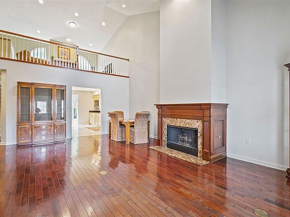 a step away from the mudroom/laundry for easy living. The Living room/dining room combo has Brazilian cherry hardwood floors w/ white plantation shutters. The large kitchen features a Jenn-Air gas cook-top, double wall ovens side X side refrigerator, travertine stone floor, granite countertops, pantry and plenty of room for a kitchen table and chairs. The daylight kitchen door leads to a beautifully landscaped private rear concrete patio and yard. The first-floor master bedroom suite has his and her closets w/ bath that features a separate tub and shower stall w/tumbled marble tile on floors and walls. The turned staircase to the second level features a den/loft with gas fireplace and two additional bedrooms with large closets. HOA covers grass cutting, mulching, trimming of shrubs and some exterior maintenance.