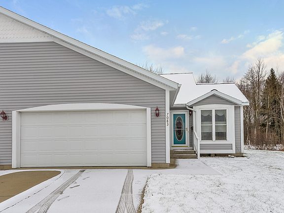 Light and lofty open-plan ranch condo with 2-stall attached garage, located between Spring Lake and Norton Shores! This 2 BD, 2 full BA home offers complete single level living, cathedral ceilings for added volume, living room corner gas fireplace and side dining deck! A desirable U-shaped kitchen with raised snack bar creates easy work space, while keeping the chef connected to the main living and dining areas. Master suite at the rear of the condo includes private bath with low threshold shower and 5'x7' WIC! Primely positioned within Brookfield Park to maximize privacy as well as wooded views, and within easy distance to several grocery stores, shopping, parks, US-31 & I-96! HOA dues of $130 per month cover snow removal, lawn care, trash and exterior maintenance. See plan for details!