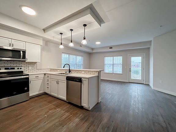 Unit 108 is a Bluebird floorplan with two bedrooms and two bathrooms. This residence is located on the northeast corner of the building on the first floor and has a large balcony.This home features an open concept floor plan with 9' ceilings. The U-shaped kitchen includes a breakfast counter peninsula and maintenance-free, stainless-steel appliances including a dishwasher, microwave, side-by-side refrigerator with ice/water dispenser, and stove. Cabinetry is white and has Quartz countertops. Cabinet pulls, faucet and light fixtures are black.The residence also has its own laundry room, equipped with a stackable washing machine and dryer. Flooring in the open concept area of the unit is luxury vinyl plank, bedrooms are carpeted, and bathroom flooring is tile.