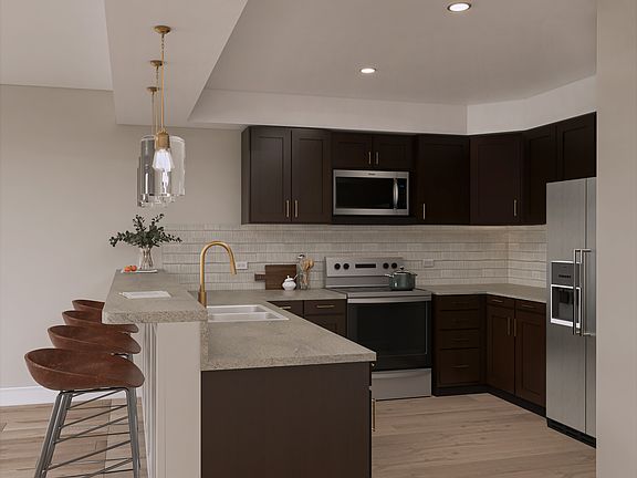 The Chickadee floorplan is a 2 bedroom, 1 ½ bath layout with 1,004 sq. ft. This floor plan is a social butterfly's dream - close to amenities with placement at the central core of the building. The U-shaped kitchen features elegant quartz countertops, stainless steel appliances (all of which are 100% maintenance-free, always!), and offers lots of space for creating your favorite meal, plus a breakfast counter for quick snacks or coffee with friends. The master bedroom has a walk-in closet and is large enough for a bed bigger than you need, but always deserve. The second bedroom is adjacent to the master bedroom and has a half-bath conveniently located across the hall. Whether used as a bedroom, home office, den, or artist's studio, this 2nd bedroom is perfect to house whatever you find yourself planning in life.In addition to more storage and linens closets, the floorplan includes a laundry room with a full-size washer/dryer and added electrical outlets for charging and storing your vacuums and other small appliances. Like all units at Gracewin, you also have a spacious patio with plenty of room for a couple of patio chairs, a decorative table and even some patio plants if desired.