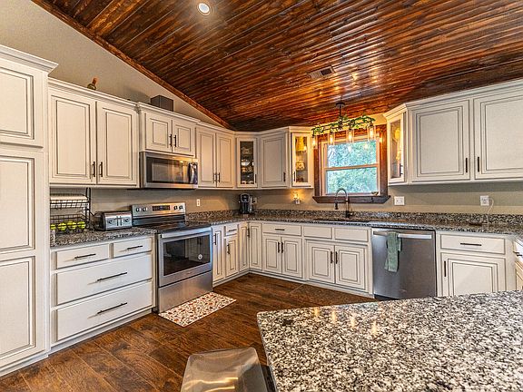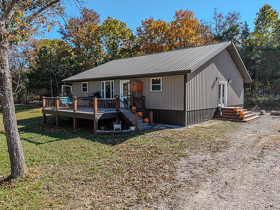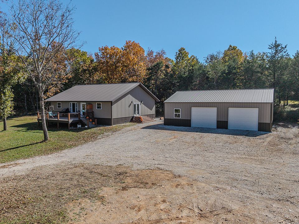 Discover your own private slice of the Ozarks with this beautiful new home, perfectly situated on 9.6 secluded acres set back off the road for ultimate peace and privacy. Step inside to an inviting open-concept floor plan featuring laminate floors throughout the kitchen, dining, and living areas. The stunning tongue-and-groove vaulted ceilings add warmth and character, making this home truly stand out. The spacious kitchen is a dream for anyone who loves to cook or entertain, featuring beautiful custom cabinetry, granite countertops, a large island with seating, and stainless steel appliances. It flows seamlessly into the dining area and expansive living room -- the perfect setup for family gatherings or get-togethers with friends. The split-bedroom floor plan offers privacy for the primary suite, complete with a large en suite bath boasting double sinks, a tiled walk-in shower, and a generous walk-in closet. Bedrooms two and three are comfortably sized with ample closet space, while the main bath includes tiled floors, a single vanity, and a tub/shower combo. Additional features include a spacious utility room with extra cabinets and a folding area, and a low-maintenance front deck with Trex decking and welded metal railings -- ideal for enjoying the tranquil surroundings. Outside, you'll find a brand-new 30x40 shop with concrete floors, power, and plumbing for water -- perfect for hobbies, storage, or a workspace. The shop also features two 10x8 garage doors for easy access and functionality. With nearly 10 acres to explore, this unique property combines modern comfort with the serene beauty of the Ozarks. Don't miss your chance to call this peaceful retreat home!