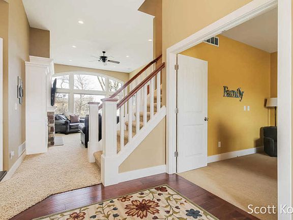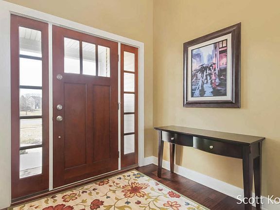 This custom Bryon Center Providence Lakes home is in like new condition and lacks for nothing! Wonderful open floor plan features a light filled gathering room with vaulted ceiling. Very upscale owners suite on the main level with four bedrooms up and two more down for guests. Quality abounds with the walk out just professionally completed with top quality finishes and includes an additional kitchen. There is an additional two stall garage beneath the upper garage for storage, workshop or toys.Overhead door to the backyard.