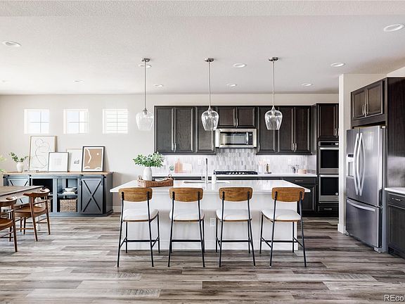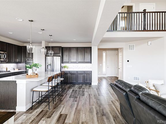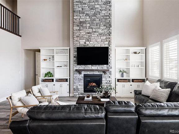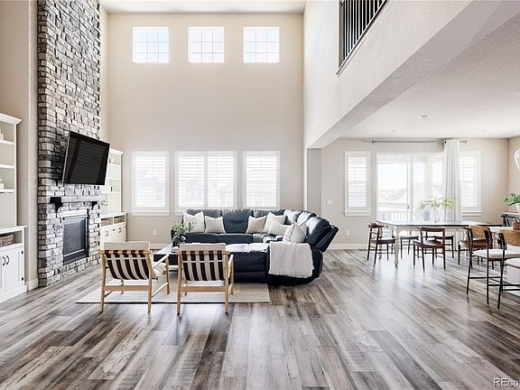 Situated in the amenity packed Southshore neighborhood you’ll discover this Taylor Morrison home with west facing windows capturing panoramic mountain views, a 3 car garage, custom shutters throughout & a walk-out basement that leads to the landscaped backyard. Step inside to be greeted by a large main floor living area with soaring 2 story ceilings where the living room, dining & kitchen flow seamlessly together. The living room centers a modern gas fireplace accented with stacked stone and shelving on either side that include smart dimmable lighting. The stylish yet functional kitchen is equipped with plentiful cabinetry to keep you organized, marble counters, high end stainless steel appliances and large walk-in pantry. Push back the slider door off the dining room to invite the outdoors in and discover the covered patio with stunning mountain views & sun shades. There is also a mudroom, full bath, & additional bedroom on this level. On the second level you will discover 2 secondary bedrooms connected by a jack & jill bathroom & both equipped with spacious walk-in closets, along with a 3rd bedroom with its own en-suite bathroom, as well as the luxurious primary suite & a laundry room. In the spacious primary suite you will find a 5 piece bath with double vanities, a large soaking tub, a glass encased shower & a walk-in closet. Step down to the newly finished basement lined with plush carpet to discover a large second living area with plenty of space for multiple entertainment areas. There is also an unfinished workshop area that guides you out into the backyard, finished with a large green space and planter box to start a garden. The unfinished workshop area offers a blank canvas for a bed/bath or whatever suits your lifestyle best with rough-in plumbing already included. This exceptional residence is further enhanced with access to Cherry Creek school district and its proximity to two pools, two clubhouses, the Aurora Reservoir, and an array of parks & trails.