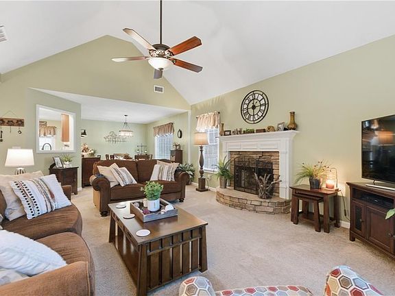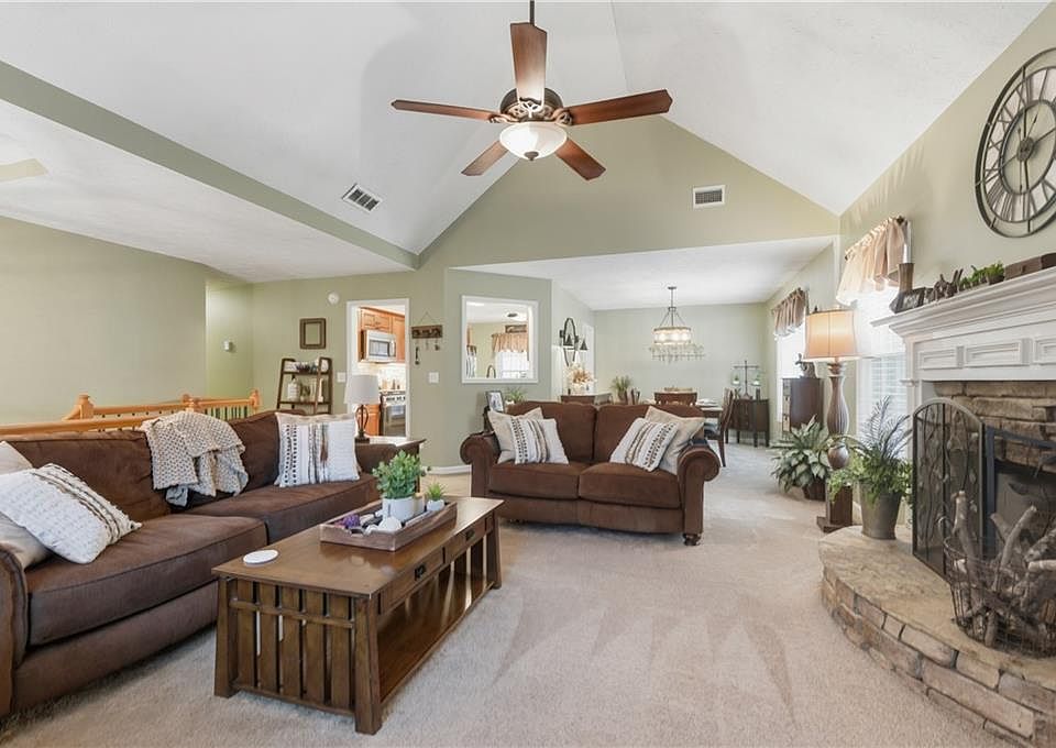 Stone fireplaceFarm style sinkPrivate fenced backyardUpdated kitchenNatural stone backsplashCherry cabinetsQuartz counters