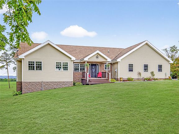 In the heart of Finger Lakes wine country, this newer impeccably built, energy-smart home features dual heating strategies: efficient heat-pump systems for heating, cooling, & hot water, alongside full-home radiant in-floor heating powered by a high-efficiency propane boiler. Every space—including the multiple heated garages—benefits from warm, evenly heated floors, enhancing comfort & usability. Multiple heated garages offer protected storage, workshop space & accessible entry into a thoughtful mudroom, conveniently adjoining both a laundry room & a full bathroom, streamlining everyday transitions. The heart of the home is a massive great room, a soaring, inviting space ideal for gathering. The kitchen delights with a generous central island that comfortably seats five, a five-burner induction cooktop, double ovens, expansive granite countertops, & an abundance of workspace—all anchored by premium Bosch appliances. The primary en-suite serves as a private retreat, complete with a generous walk-in closet featuring built-in storage cabinets that elevate both style and function. The spa-inspired bathroom offers a luxurious jetted tub, a separate glass-enclosed shower & thoughtful finishes. Seamless, intimate, & beautifully appointed—this suite combines tranquility, organization, & indulgence. With another en-suite bedroom & a third full bath, there’s flexibility to convert other areas into additional bedrooms. Outdoors, an abundance of decks, porches, covered outdoor areas- including a hot tub- wrap the home, creating seamless indoor-outdoor flow & inviting living spaces. With distant, panoramic views, the design emphasizes expansive outdoor enjoyment without compromising intimate comfort in the well-insulated private quarters. Built with advanced construction techniques, structural insulated panels, triple pane windows & the combined efficiency of heat-pump technology & a condensing propane boiler, this home blends performance, warmth & a strong connection to its surroundings. Check out the virtual tour to see every square inch of this home then make an appointment to view it today. Sqft based on laser measurements.