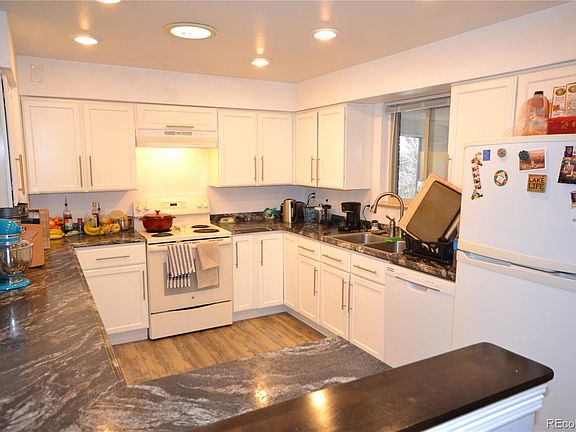 Hackberry Hill. Check out this Tri-level with a finished basement and one car garage on a big corner lot. Features a Large Kitchen with Newer White Cabinets and sun tube, open to Living Room with a wood burning fireplace. Basement can be used as a bedroom with a walk-in closet and egress window, or as a family room, and currently used as a bedroom suite. Radon system is installed. Newer furnace and A/C plus attic fan. Newer gutters. Unique plan with 2 bedrooms and one bathroom up, lower level with small bedroom and small family room and door to outside as well as 3/4 bath. Basement features a huge finished multi-purpose room as well as utility. Washer and Dryer Included. Sun Porch off Dining Room. Eastern/City views from one bedroom. Low maintenance front yard and back yard is fenced with sprinklers and two storage sheds. Two driveways up front. 2 block walk to Thundercloud Park with its amazing panoramic views. Close to Arvada Center for the Arts. Move in Ready home ! Showings can start at noon on Friday.
