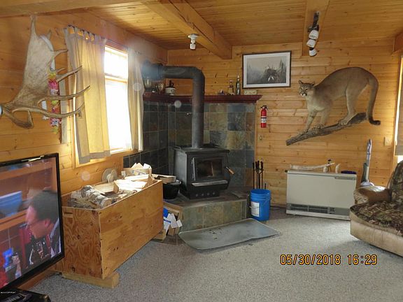 Charming knotty style Alaska wood home. Country living with modern construction. Entire upstairs is one bedroom that could easily be converted to two bedrooms. Very nice wood interior with a deer antler chandelier. Wood stove and covered deck. 2 car garage (currently used for storage) has an easily removed wood partition. Must see to appreciate.