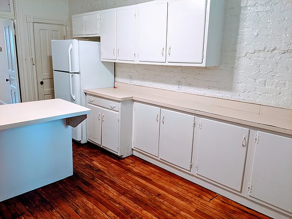 Newly finished wood floorsExposed brick wallsThree bedroomsComfortable eat-in kitchenFull-sized washer and dryerCharming pocket doorRadiator heat