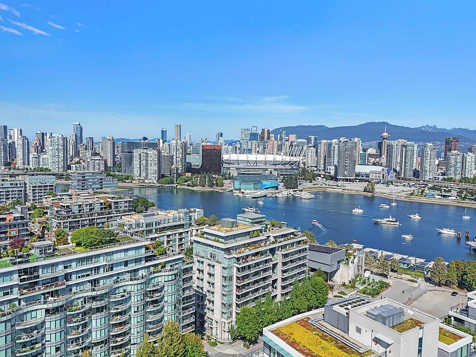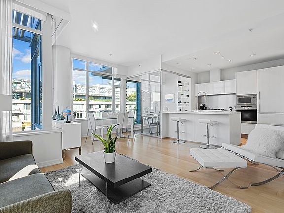 Absolute luxury in the heart of the Olympic Village! This SW corner unit is bathed in natural light, featuring a spacious patio & a versatile den perfect for a home office. Once the display suite, this one-owner home is packed with designer upgrades! LEED Platinum certified, this sustainable gem offers soaring 9'8" ceilings, a sleek German kitchen, luxury faucets, hardwood floors, California closets, & high-end Miele appliances, including a gas range and Sub-Zero fridge. Enjoy comfort year-round with heat and AC via a Geothermal radiant system. Indulge in the 5-star Gold Medal Club amenities, featuring an indoor pool, steam room, sauna & fitness centre. Just steps from the Canada Line & Expo Skytrain, Aquabus and the seawall, plus 1 EV parking spot & concierge service. Everything you need!
