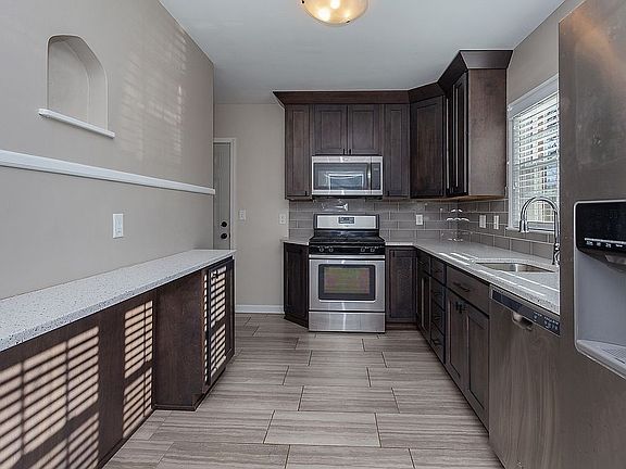 **Willing to work with a buyer’s agent** Beautifully remodeled brick home that is move-in ready. Remodeled kitchen with quartz countertops, dark birch cabinets, new stainless steel microwave, refrigerator, gas range & dishwasher, brand new tile and backsplash. All appliances stay! Plus, a bonus eat-in breakfast bar. Large living room that is big enough to fit a dining table and sitting area. New crown molding in hallway. Gas fireplace. Remodeled full bathroom with a new toilet, bath liner and pedestal sink. New windows and carpeting. Large linen closet in hallway. Two good sized bedrooms with larger closets. Nice sized basement area, partially finished.Homeowner added new plumbing and sewer line in 2020. New insulated garage door and garage motor. Radon mitigation system. Huge backyard with mature trees and storage shed. New cement stairs and two patios recently added to the backyard: plus, a fire pit area.