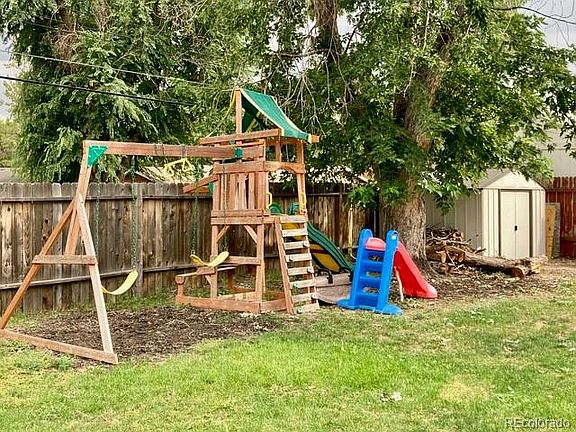 Don't miss out on this great tri-level home with 4 bedrooms, + (a 5th non-conforming bed currently used as a work out room), 1-3/4 baths, stucco exterior and 5-yr roof certificate. Step into the expansive, open main level living area with warm oak hardwood flooring and newly painted walls. The living room, featuring a wood-burning fireplace, flows into the dining area and the kitchen. The portable island and stainless steel appliances in the kitchen convey. The upper level includes the master bedroom and 2 additional bedrooms with hardwood flooring, plus a full bath boasting a double vanity, tiled tub/shower surround and tiled flooring. The cabinet in bedroom #2 stays. Access the upper level bath from the master bedroom and the hallway. On the lower level, you'll find a tiled, freshly painted family room, carpeted bedroom with portable wardrobe (conveys), work-out room and 3/4 bath featuring a tiled shower surround and tiled floors. A large pantry (6x3) and laundry area, with washer and dryer included, complete the lower level. Your kids will have so much fun in the fully-fenced back yard playing on the swing set that stays. Enjoy outdoor get-togethers on the large patio and store all of your outdoor equipment in the storage shed. The window A/C unit in the kitchen and 2 portable swamp coolers will stay with the home. You'll appreciate low taxes, no HOA and RV parking!!!