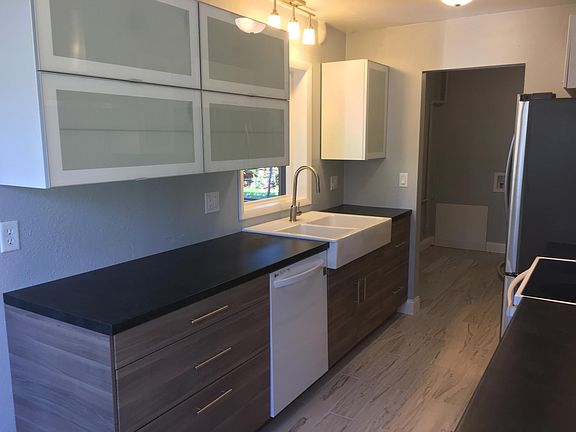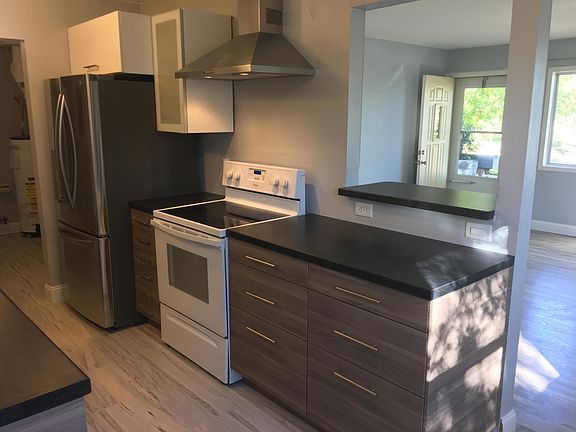 Completely remodeled kitchen with Ikea cabinets with soft close drawers and doors, Stainless steel refrigerator with ice and water in door, stainless steel exhaust hood, flat top stove, dishwasher and tile floors. Tile floors flown into utility room where laundry hookups are located. Laminate flooring throughout the rest of the house. Completely remodeled bathroom with subway tile and glass tile accents, modern sink/vanity combo, and slate flooring.
